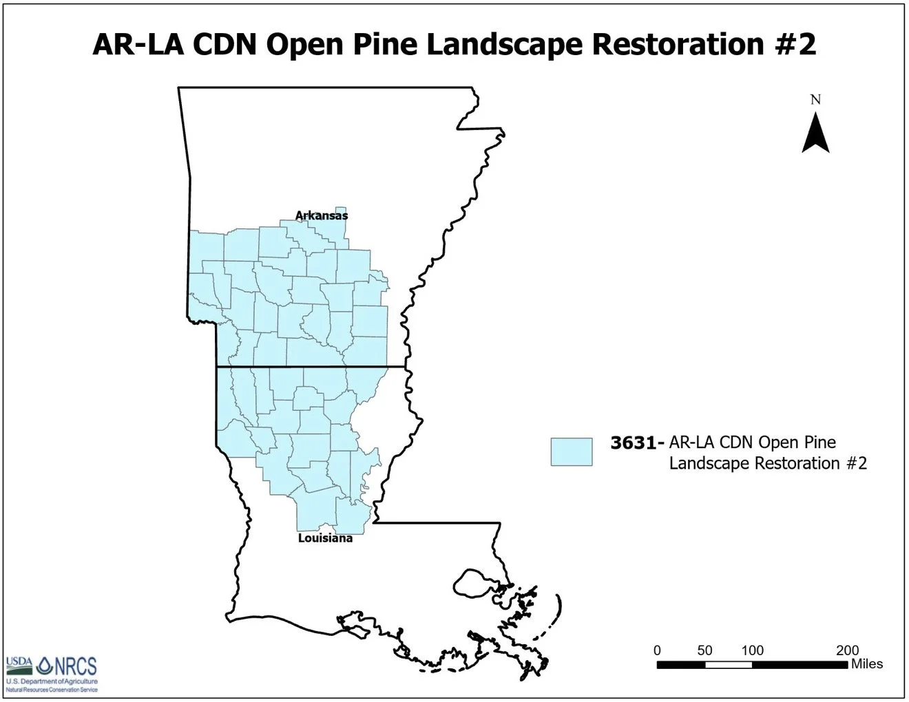 See the AR-LA WGCP CDN Open Pine Landscape Restoration RCPP #2 (3631) Boundary map below.